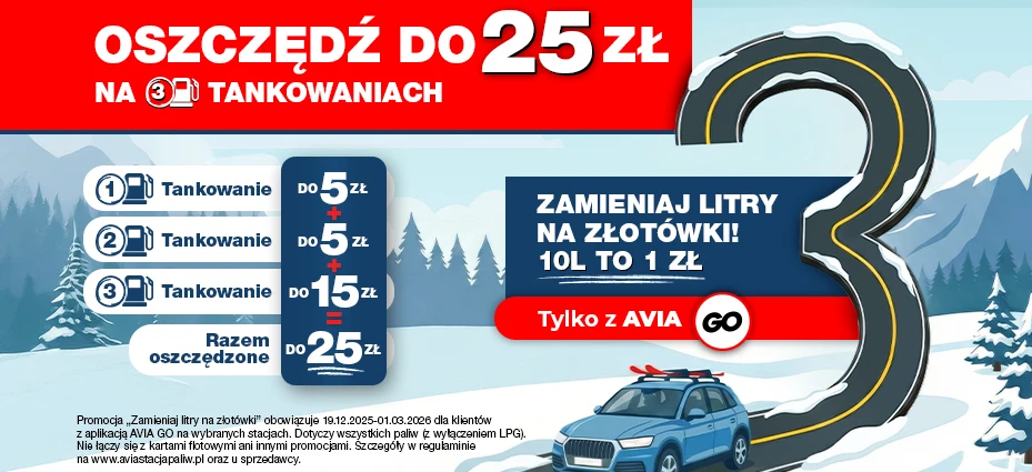 Grupa Unimot, właściciel sieci stacji paliw AVIA w Polsce, informuje o starcie atrakcyjnej promocji skierowanej do użytkowników aplikacji mobilnej AVIA GO. Akcja pod hasłem „Zamieniaj litry na złotówki z aplikacją AVIA GO i oszczędzaj do 25 zł” będzie obowiązywać od 19 grudnia 2025 r. do 1 marca 2026 r. na ponad 60 wybranych stacjach AVIA. Nagradzane są regularne wizyty na stacjach – za pierwsze dwa tankowania klienci otrzymują rabat za każde 10 litrów paliwa, natomiast przy trzecim tankowaniu zniżka zostaje potrojona. Po trzecim tankowaniu licznik resetuje się, a uczestnik może rozpocząć nową serię i ponownie korzystać z promocji.